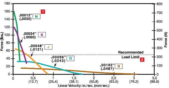 Once the required actuator frame size is determined and the linear velocity is calculated, the “force vs. linear velocity curve” is used to determine the proper resolution of the actuator lead screw. Each curve represents the maximum force that can be generated by the actuator at that speed for that specific screw, or 100% of rated load/force. It is also under the condition of going at speed from a standing start.