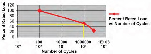 Step 2: As indicated in the chart, in order to get 1,000,000 cycles, a factor of 0.5 as 50% rated load must be used when sizing the actuator. The initial rated force required in order to meet the load after 1,000,000 cycles is: