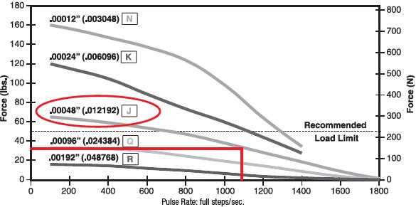 As determined by the life calculation performed above, an initial load of 30 lbs is to be moved at a velocity of 0.5in/s. The resulting lead screw resolution required in the Size 17 hybrid motor is 0.00048” (J resolution), as indicated in Figure 4.