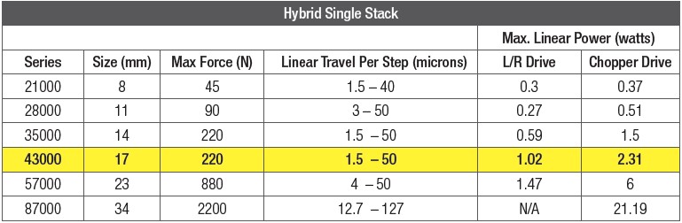 Step 2: Use Table 1 to determine the correct frame size actuator. As discussed earlier in the article, most applications will use a chopper drive to supply the required input pulses to the stepper motor. The 43000 (Size 17 Hybrid) was chosen for this application, as highlighted below in the Hybrid Single Stack section of Table 1, shown again below.