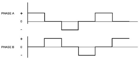 Figure 1 illustrates a typical step sequence for a two phase motor. In Step 1 phase A of a two phase stator is energized. This magnetically locks the rotor in the position shown, since unlike poles attract. In step 2, phase A is turned off and phase B is turned on. The rotor rotates 90° clockwise. In Step 3, phase B is turned off and phase A is turned on but with the polarity reversed from Step 1. This causes another 90° rotation. In Step 4, phase A is turned off and phase B is turned on, with polarity reversed from Step 2. Repeating this sequence causes the rotor to rotate clockwise in 90° steps. See Figure 2 for an electrical representation of the current flow in the two phases.