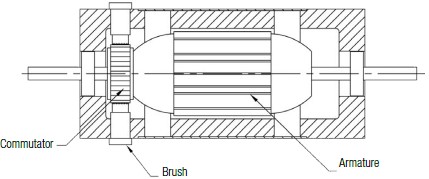 Brush type DC motors have several coils wound on a rotor or armature. These coils are connected to a commutator. The commutator consists of copper segments. See Figure 6. In this example shown, there are twelve coils so one step is or 30°. The switching is done mechanically instead of electronically by means of a commutator with 24 copper segments. The coils are connected to the copper segments. Two brushes, 180° apart connect to the appropriate coil which rotates the rotor