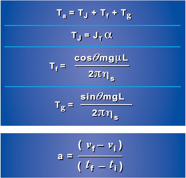 Ta = (JT x α) + [(cosΘmgμ x L) / (2π x ηs)] + [(sinΘmg x L) / (2π x ηs)]