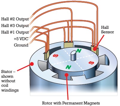 Hall Effect sensors on brushless DC motors provide the position of the magnetic pole on the motor rotor (rotating element) relative to the motor phase coil windings on the motor stator (stationary element). The Hall Effect sensors are used to indicate which stator phase winding to energize to generate the maximum motor torque in the desired direction of rotation.