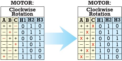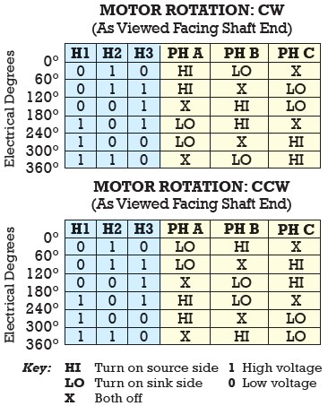 The relationship between Hall Effect switch states and optimum motor phase coils excitation can be provided in tabular form. An example is provided below in (Figure 2):