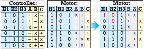 The resulting table correlating motor phase excitation to hall sensor state is illustrated below: