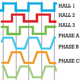The three Hall Effect sensors are spaced equal angular distance apart to detect the location of the rotor magnetic pole relative to the three equally spaced motor phase windings (Figure 1). The three hall sensor switch states are used to indicate which motor phase coils to energize to produce maximum torque on the rotor.