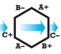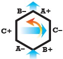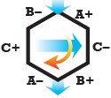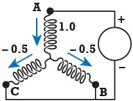 This method can be used to measure the Hall Effect sensor correlation table if this information is not available. This method involves injecting a fixed DC current into the motor phase windings to create a fixed electromagnetic pole on the stator periphery, as illustrated below. The motor is placed on a bench without any load coupled to