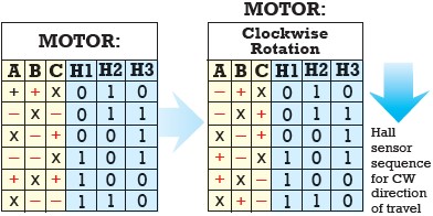 Illustrated below are example Hall Effect sensor tables for an electronic controller and a motor.