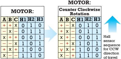 The motor phase sequence to energize to produce counter clockwise rotation at a given rotor position provided by the hall sensor states is provided below:
