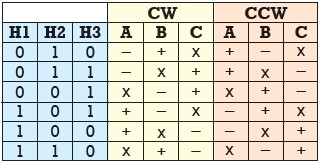 | Figure 2. Table of hall sensor states and motor phase excitation to produce the maximum torque in the desired direction of rotation. |