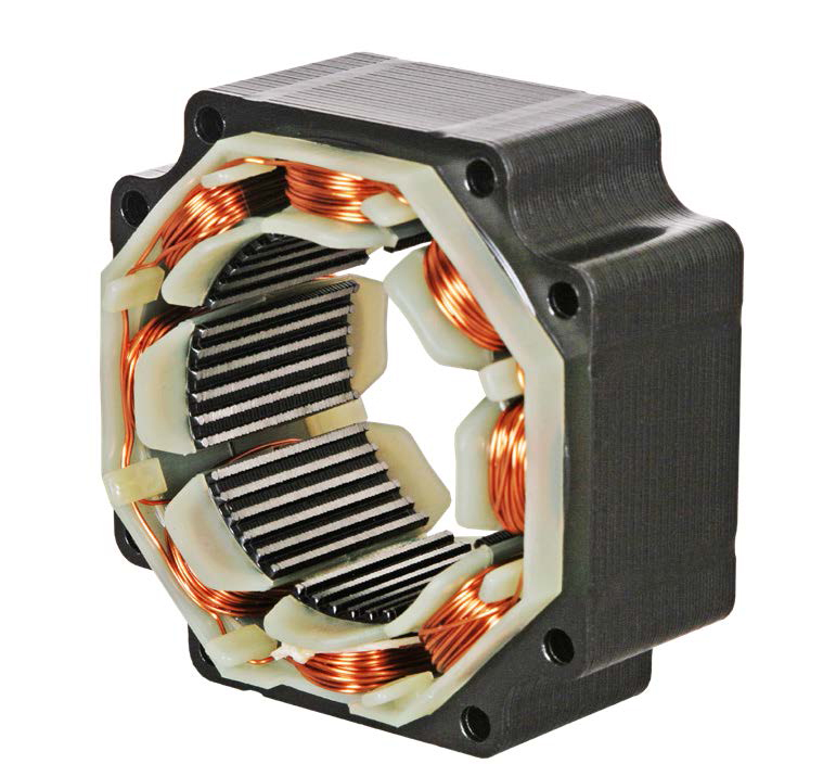 The first reason is the use of a laminated Silicon steel stator assembly in the hybrid motor, see Figure 1, compared to a stamped low carbon steel field ring assembly in the Can Stack Motor, see Figure 2. The use of a laminated stator stack in the hybrid motor construction results in less eddy current loss and the Silicon steel material used in the lamination construction reduces hysteresis loss. Therefore the total iron loss in the hybrid motor is less than the Can Stack Motor resulting in the hybrid motor’s higher efficiency, series, 1.8 degree/step and .9 degree/step (versus 7.5 or 15 degrees for the typical Can Stack) will allow resolutions down to .000060 in.[0.001524 mm]/full step compared to .00025 in.[0.00635 mm]/full step in a Can Stack Motor. Therefore the hybrid motor provides much finer positioning capability.