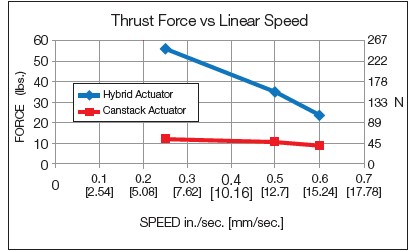 Comparing the size 17 single stack hybrid actuator (1.7 in.2 [43 mm2]) and the 46000 Can Stack Actuator (Ø1.8 in. [Ø 46 mm]), 7 watts and 10 watts of input power respectively, with the identical lead screw; the resulting force at the same linear velocity is much higher in the hybrid version, see Figure 5.