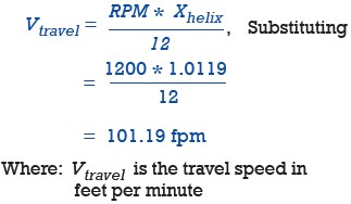 The capabilities of engineered polymers in a leadscrew application are dependent on the application specifications. Let’s say we have an 18.5 lb. load, which we want to move at 2 in/s. To calculate PV of this system we still need the diameter and lead of the lead screw. If we select a 0.375 (3/8) inch diameter by 0.1 inch lead, we can now calculate the PV of the application. Helical Travel tells us the linear distance the nut travels during each revolution,