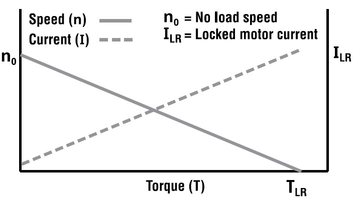 The example motor curve as shown in Figure 1 removes all other variables and assumes the motor is tested with a fixed terminal voltage using a low impedance power supply and progressively loaded with a dynamometer. The test is performed as quickly as possible to minimize motor temperature rise. If the motor being tested is a small sub-fractional horsepower motor, the dynamometer may load the motor until shaft speed hits zero or close to zero RPM. In the case of larger motors, the dynamometer may be set to progressively load the motor to approximately the maximum power point. The remainder of the curve may then be extrapolated. The resulting data in either case are (theoretically) linear speed versus torque and current versus torque curves.