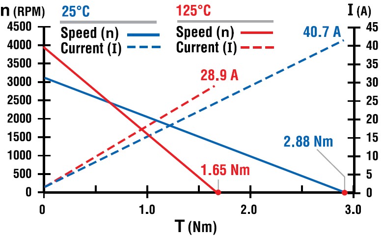 As the motor temperature increases, the resistance will increase and the torque constant and voltage constant will decrease. This results in an increase in no-load speed and a decrease in locked-rotor torque. Figure 2 illustrates an example of both “cold” and “hot” running conditions of the same DC motor. The “hot” motor curve demonstrates how much the performance can change when operating the motor at an elevated temperature.