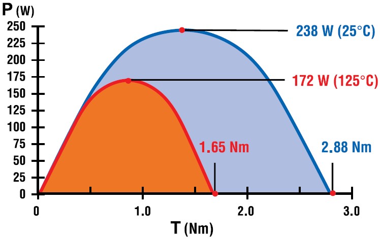 The phrase “motor constants”, however, is somewhat of a misnomer. Winding resistance and permanent magnet flux density will change as temperature changes. As the motor temperature increases, winding resistance will increase based on the temperature coefficient of copper. The flux density of the permanent magnets will also decrease as a function of temperature. Changes in these 2 key components of the motor will result in an increase in motor no-load speed and a decrease in motor locked rotor torque altering the overall slope of the motor curve. Once the user understands this concept, it becomes clear that motor performance determined using a rapid dynamometer test with a room temperature motor is significantly different than the motor performance when operated at its maximum temperature under load.