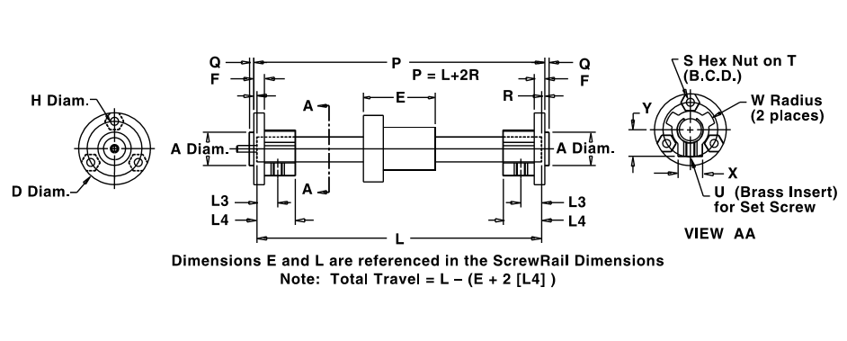 As an additional option for all Kerk® ScrewRails, standard End Supports offer the convenience of simple and compact mounting for the ScrewRail. The End Supports are designed to slide over the outside diameter of each end of the rail and “key” off the slot in the ScrewRail. The Kerkite® composite polymer End Supports come standard with three hex nuts that are captured in the flange for easy assembly. The End Supports are also supplied with a brass threaded insert and a set screw to fasten to the outside diameter of the rail.